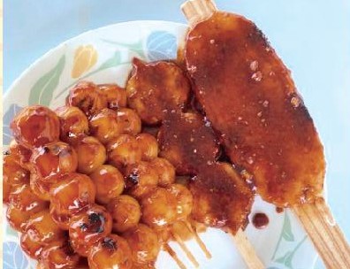 定番のみたらしだんご、五平餅、お好み焼き、焼きそば、ソフトクリームなどをお値打ちに販売。国道247号線沿いにある大きな看板が目印。